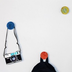 De un sólo color o con mezclas de colores, cada perchero es único. Tiene una cara plana, de 6cm de diámetro, ideal para colgar maleta, bolsos, sombrillas, etc. Hecho con plástico reciclado.